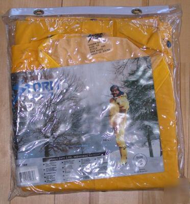 This men's yellow rain suit, style S89 by "STORMBREAKER", has a jacket, detachable hood and bib pants. The size is 4X. It has a comfortable fit. They retail on line for $12.00.